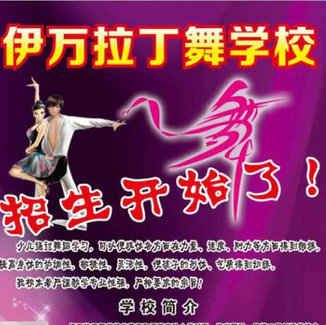 伊萬拉丁舞學(xué)校于2014年創(chuàng)辦,學(xué)校坐落于和平路實驗小學(xué)對面,滏興國際一號樓二層劍橋?qū)W校內(nèi)。伊萬拉丁舞學(xué)校的李永輝老師,門丹