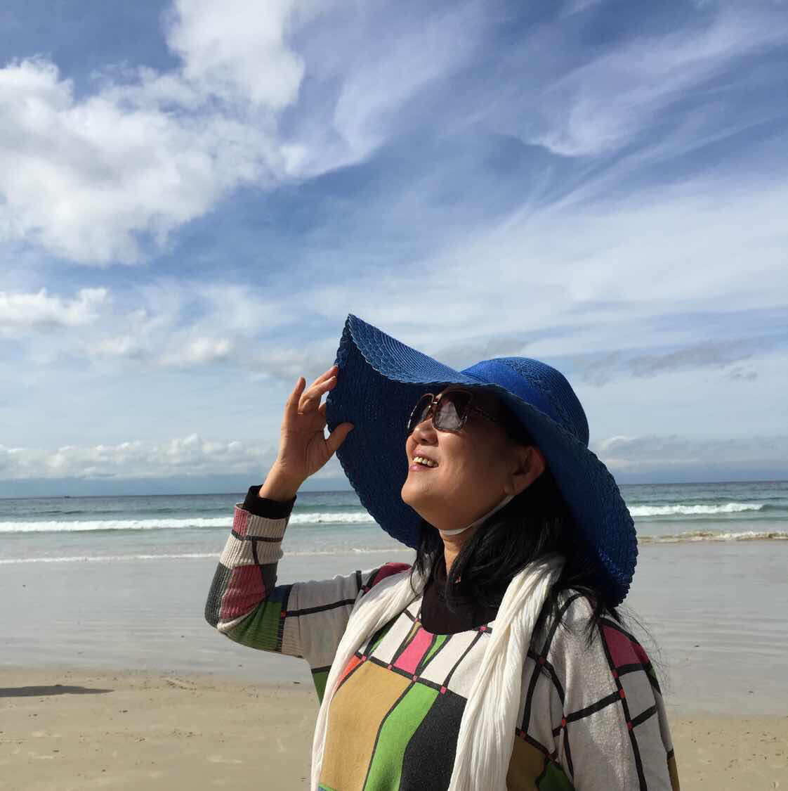 小區(qū)里見到一位老者,七十多歲,腰板筆直,皮膚白細(xì),微燙的銀發(fā)一絲不亂。一身寶藍(lán)裙子,外搭深藍(lán)絲長(zhǎng)衫,裙角素素點(diǎn)綴著幾朵銀